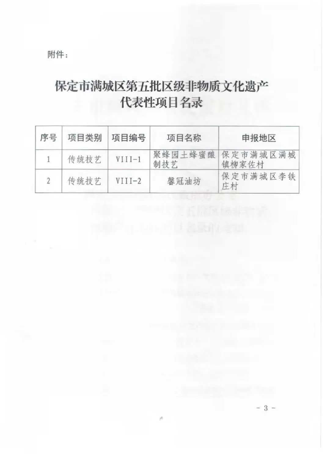 根據(jù)《中華人民共和國非物質文化遺產法》《河北省非物質文化遺產條例》有關規(guī)定,經個人自愿申請、文化旅游行政部門逐級審核推薦、組織專家評議、社會公示等程序,認定第五批滿城區(qū)非物質文化遺產代表項目的有“馨冠油坊”、“聚豐園土蜂蜜釀制技藝”。
